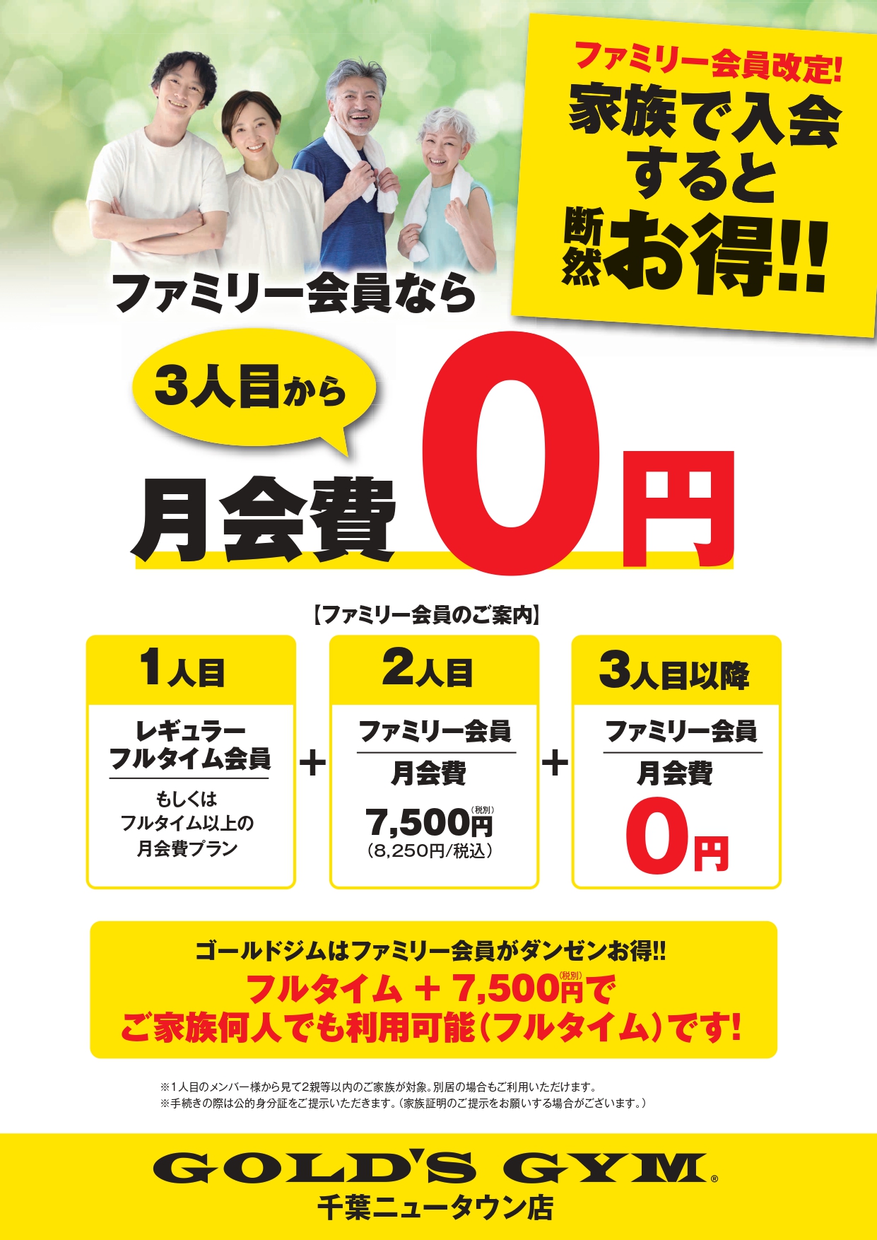 ゴールドジム千葉ニュータウン店より大変お得なファミリー会員のご案内です。