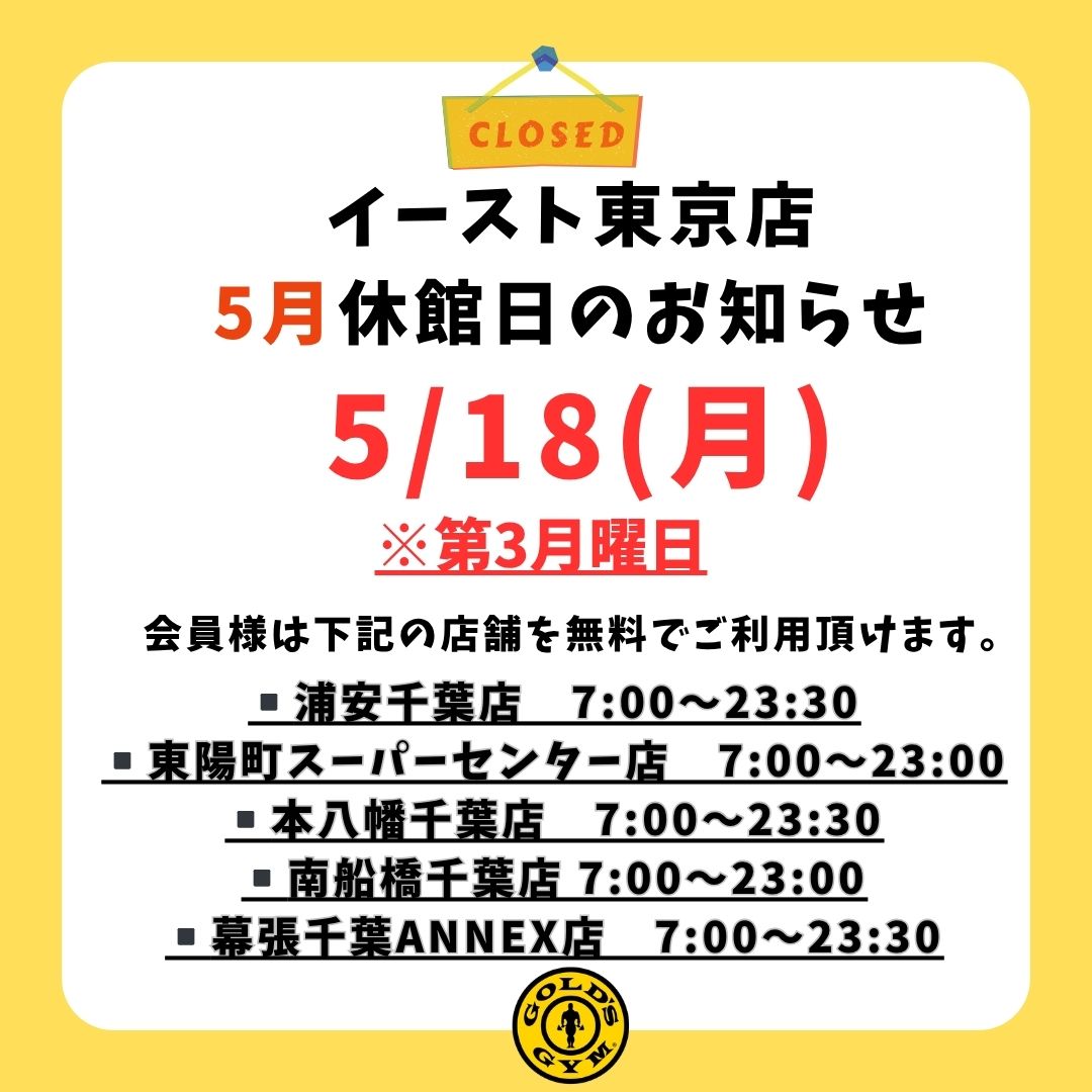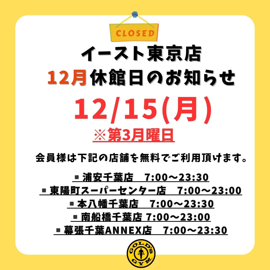 ※休館日は浦安店・東陽町店・行徳アスレチックセンター店・本八幡店・南船橋店のご利用が可能です。