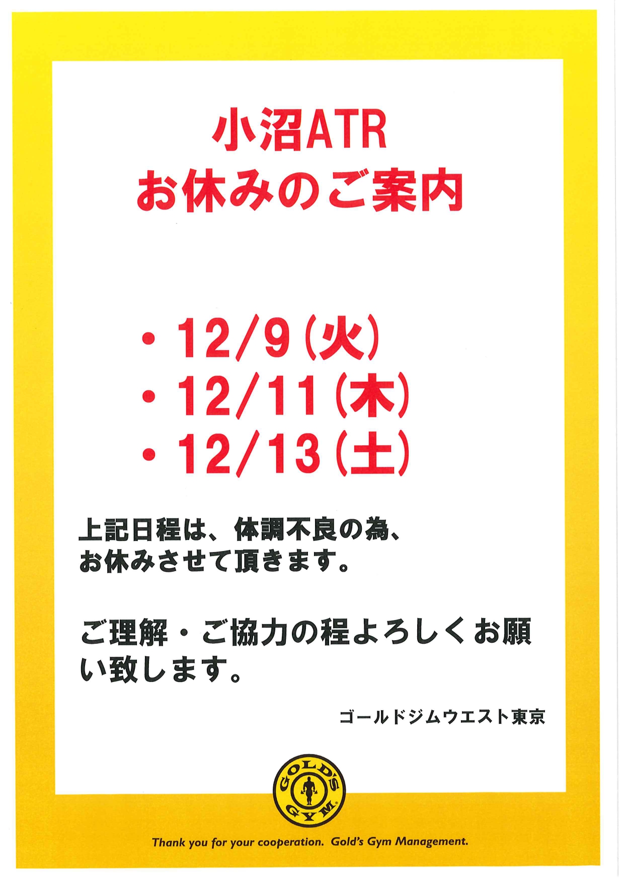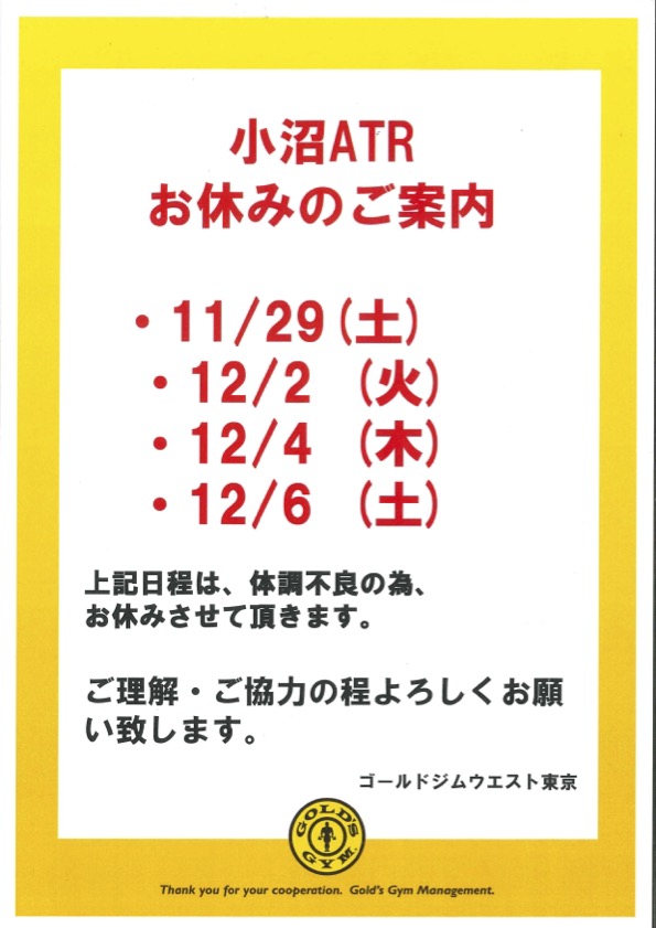 小沼アドバンストレーナーお休みのご案内|ウエスト東京