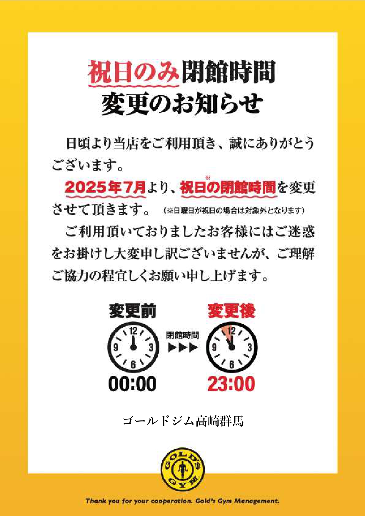 祝日のみ 閉館時間変更のお知らせ|高崎群馬
