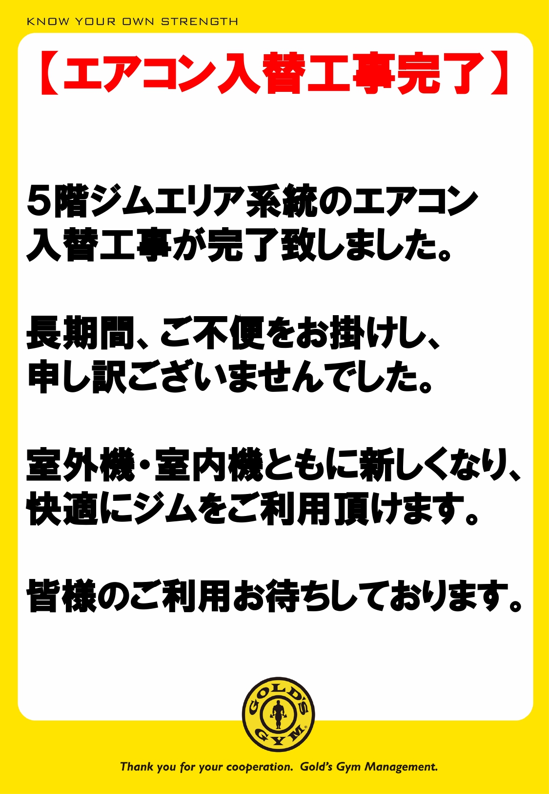 ゴールドジム厚木神奈川ジムエリアのエアコン修繕完了のお知らせを致します。