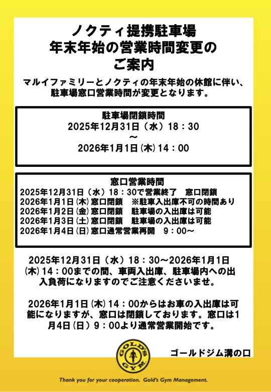 ゴールドジム溝の口神奈川店の提携駐車場のノクティ駐車場の年末年始営業時間のご案内になります。