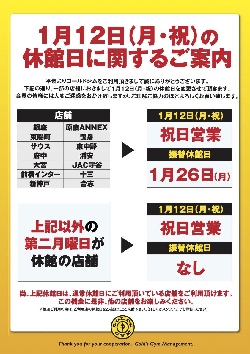 2026年1月度一部店舗休館日変更のご案内|全店舗