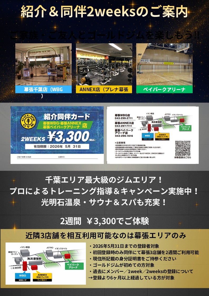 ・初回登録時のみ、同伴来館で幕張3店舗を2週間利用可