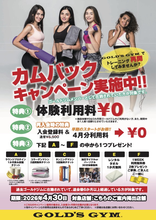 ※入会特典は過去ゴールドジムに在籍されていて、退会後6ケ月以上経過している方が対象です。