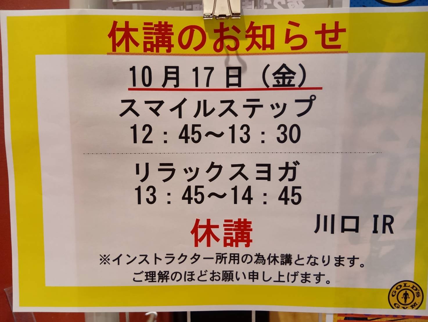 10月17日(金)レッスン休講のお知らせ(スマイルステップ、リラックスヨガ)