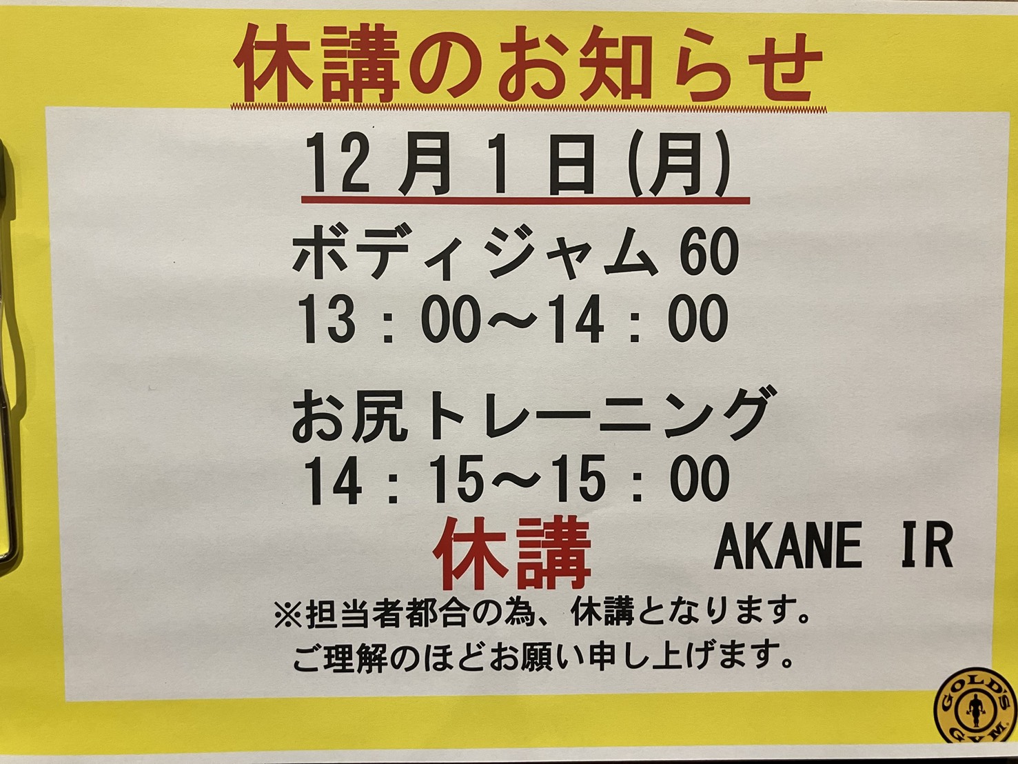 12月01日(月)レッスン休講のお知らせ(BODYJAM45、お尻トレーニング)