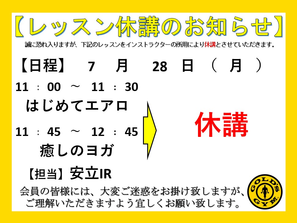 7月28日㈪レッスン休講のお知らせ(はじめてエアロ、癒しのヨガ)