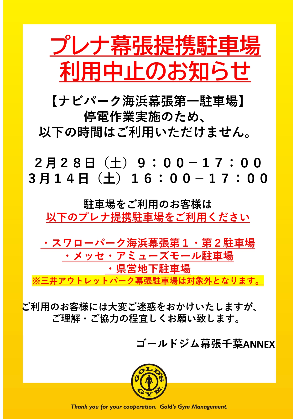 ゴールドジムからのお知らせ