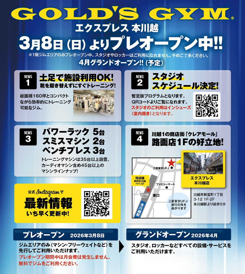 ゴールドジム「エクスプレス本川越店」3月8日12:00より、ジムエリアプレオープン